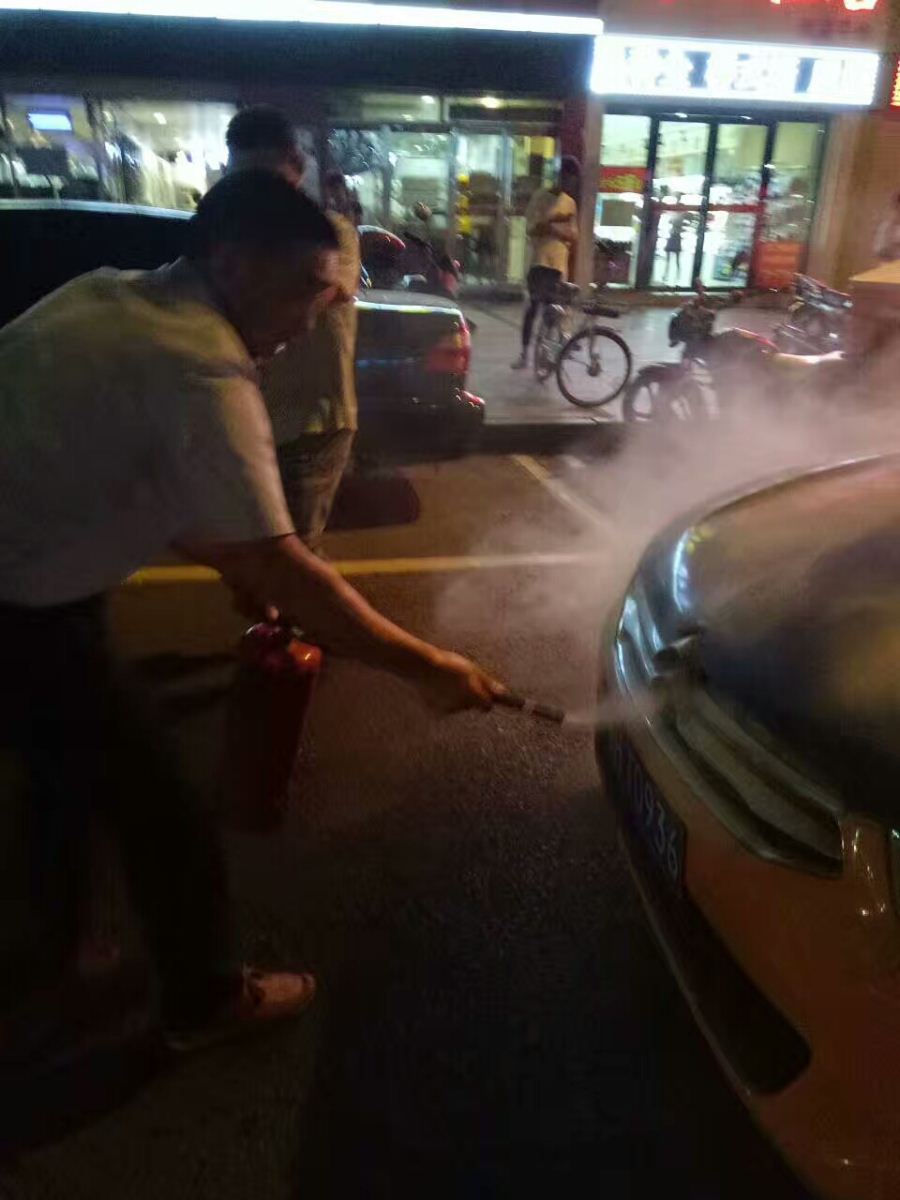 7月21日晚9時10分左右,公交集團三公司2路車駕駛員陳旭駕駛鄂H0A073號行駛至金地廣場站,突然聽到馬路對面有人大聲疾呼“著火啦!救火!”,陳師傅忙停穩(wěn)車,只見對面一的士引擎蓋冒煙起火,他立即拿起公交車上的滅火器快跑到馬路對面,將出租車的火撲滅。